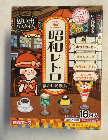 粉末タイプの昭和レトロの入浴剤😅ホットコーヒーにメロンソーダ、カラメルプリン、フルーツミックスパフェの4つの香り☕️🍈🍮🧁ちょうど夏用の柑橘系の入浴剤が昨日で終わったので、今日の夜から使ってみようと思います^_^