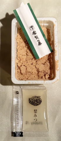 きな粉に埋もれたお餅に『梨みつ』ていうのが付いていて、かけて食べるそうです🥣う〜ん🤔何かに似てる…と思ったら、信州名物の信玄餅だ❗️信玄餅もきな粉に埋もれたお餅に黒蜜をかけて食べる、私の大好きなお菓子😆