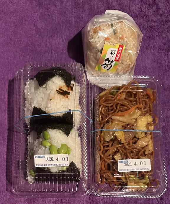 いつも買ってきてくださるお米屋さんのおにぎりもありがとうございます😊4月だから新発売が出てたんですね😆それと、もしかしたら4月からなくなるかも…て思ってたらタケノコの炊き込みご飯のおにぎり、まだあったんですね✌️…という事で、今回のおにぎりは新発売の枝豆とタケノコの炊き込みご飯と昆布、それからお惣菜の焼きそば🍙🍙🍙🍜